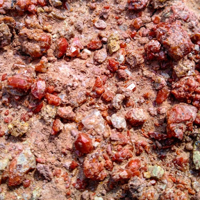 Las lluvias habían lavado las arcillas que los recubrían y quedaban a la vista. Eran pequeños, milimétricos, pero muy numerosos. Eran cristales de Jacinto de Compostela, denominación procedente de la tradición que afirma que eran portados por los peregrinos que seguían la ruta jacobea. También es conocido como cuarzo hematoide, por su color.
