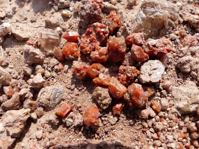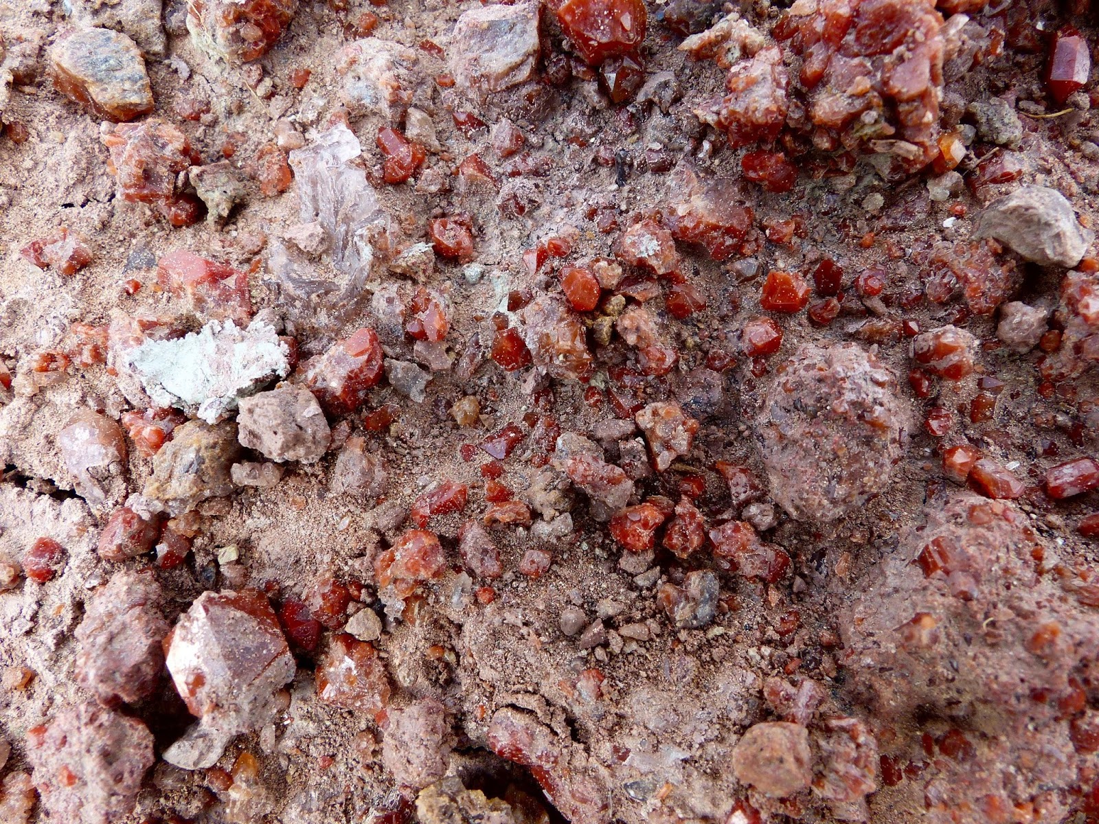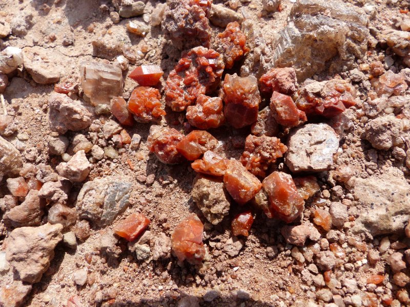 Las lluvias habían lavado las arcillas que los recubrían y quedaban a la vista. Eran pequeños, milimétricos, pero muy numerosos. Eran cristales de Jacinto de Compostela, denominación procedente de la tradición que afirma que eran portados por los peregrinos que seguían la ruta jacobea. También es conocido como cuarzo hematoide, por su color.