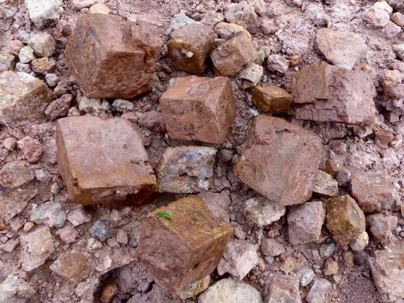 Eran unos cristales más grandes, de varios centímetros. También eran regulares, los más con hábito de romboedro. Tenían el color de la arcillas entre las que aparecían. De hecho no tenían brillo. Entonces pensé que por estar finamente cubiertos por arcilla. En casa ya, tras la limpieza de la superficie de los mismos, vi que no era así. No eran cristales traslúcidos.