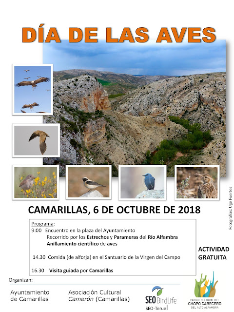 El próximo 6 de octubre celebraremos el Día de las Aves en el Parque Cultural del Chopo Cabecero del Alto Alfambra. Tendrá lugar en la localidad de Camarillas visitando los Estrechos del río Alfambra a su paso por esta localidad y las parameras que se extienden en su entorno, complementando la mañana con un taller de anillamiento científico de aves.