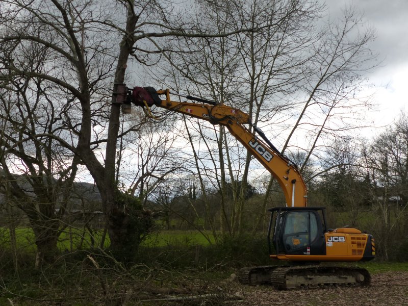 Sobre una máquina retroexcavadora de uso polivalente se puede instalar un cabezal dotado de grapas y motosierra que, a una altura variable, agarra y corta las ramas de los trasmochos, introduciéndolas después en una trituradora que produce astillas.