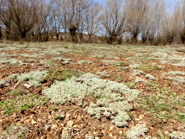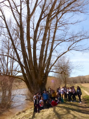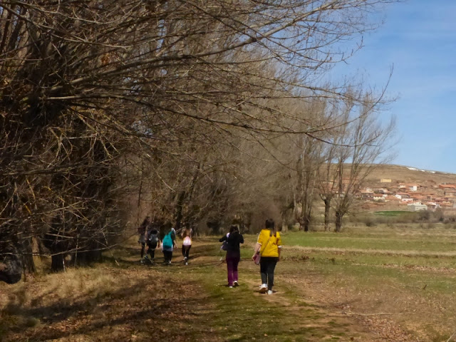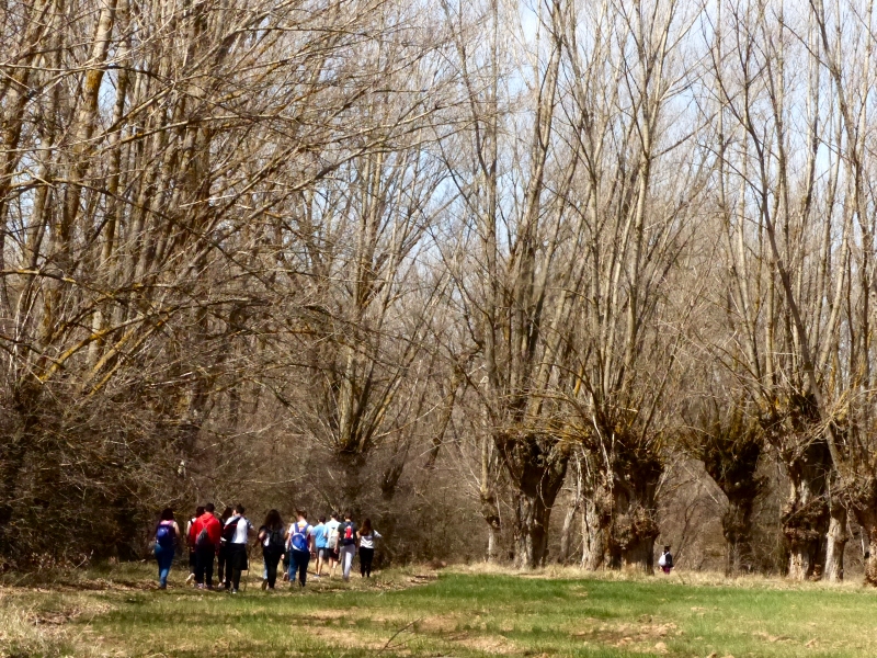 El grupo de alumnos se fue estirando, siguiendo el recorrido del sendero turístico PR-TE 51. Es un paseo muy cómodo entre los grandes árboles de la ribera y los campos de cereal orlados con espinos.