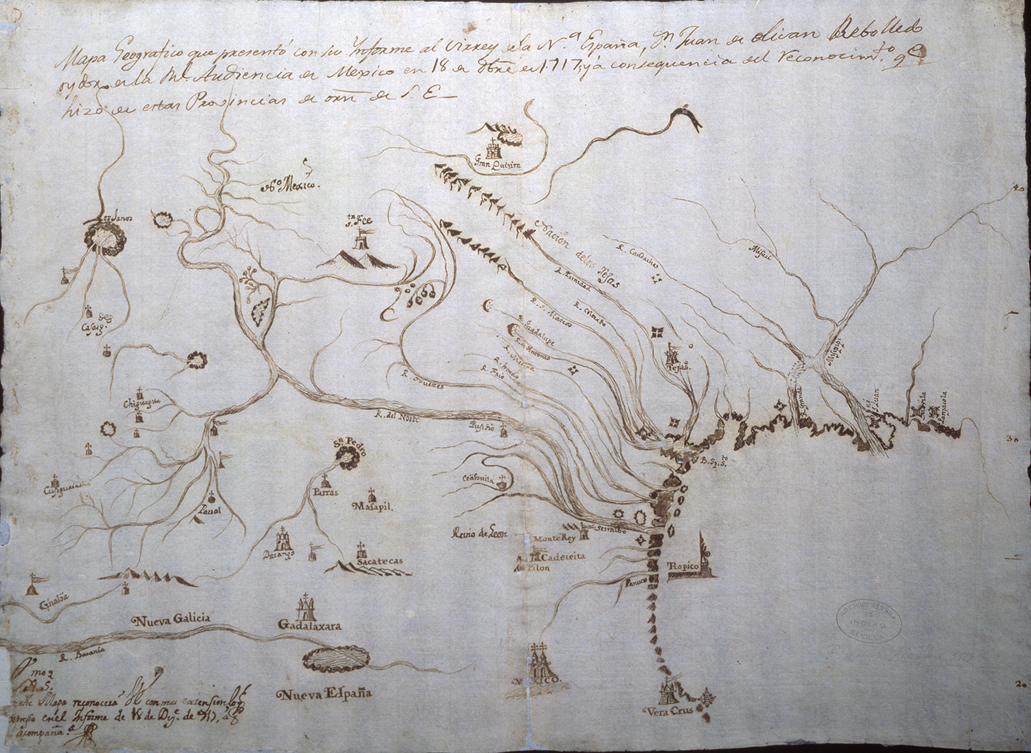 | J. Oliván Rebolledo (1717) Mapa de las poblaciones de la costa del Seno mexicano. https://sites.google.com/site/tamaulipasysupatrimonio/ |