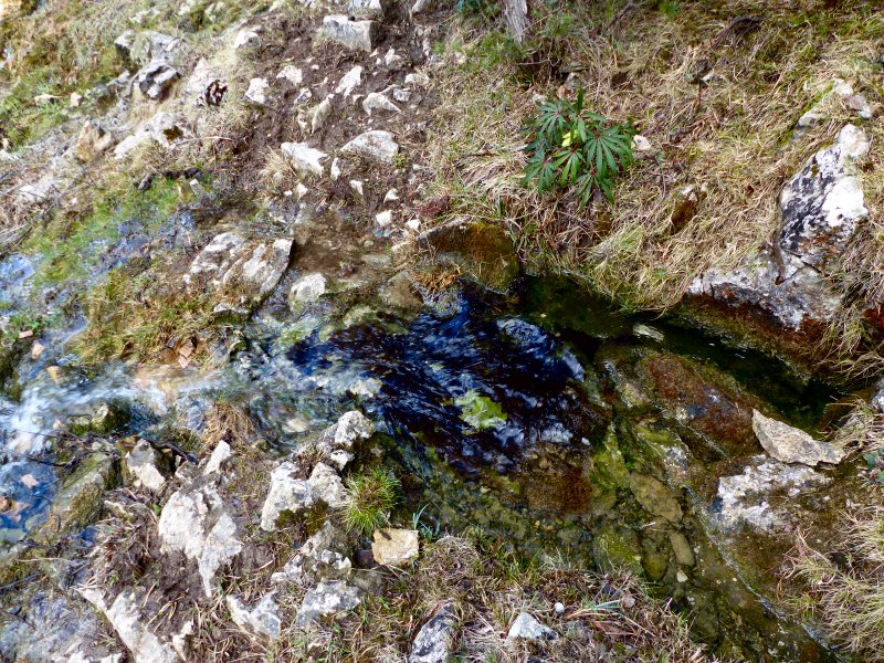 Cerca de la poza, en la margen izquierda del barranco, encontramos una surgencia que así interpretamos.