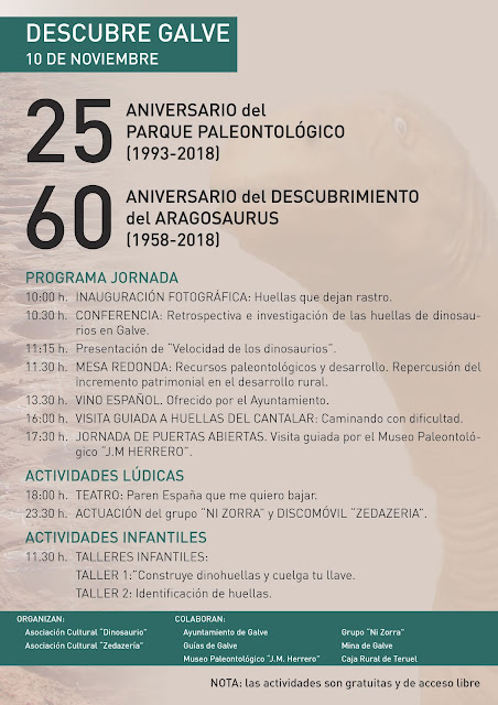 Se acumulan los eventos científicos y culturales en el Alto Alfambra. Algunos son muy importantes, como el que se celebrará en Galve el próximo sábado 10 de noviembre: el 25 Aniversario del Parque Paleontológico de Galve y el 60 Aniversario del hallazgo del Aragosaurus.