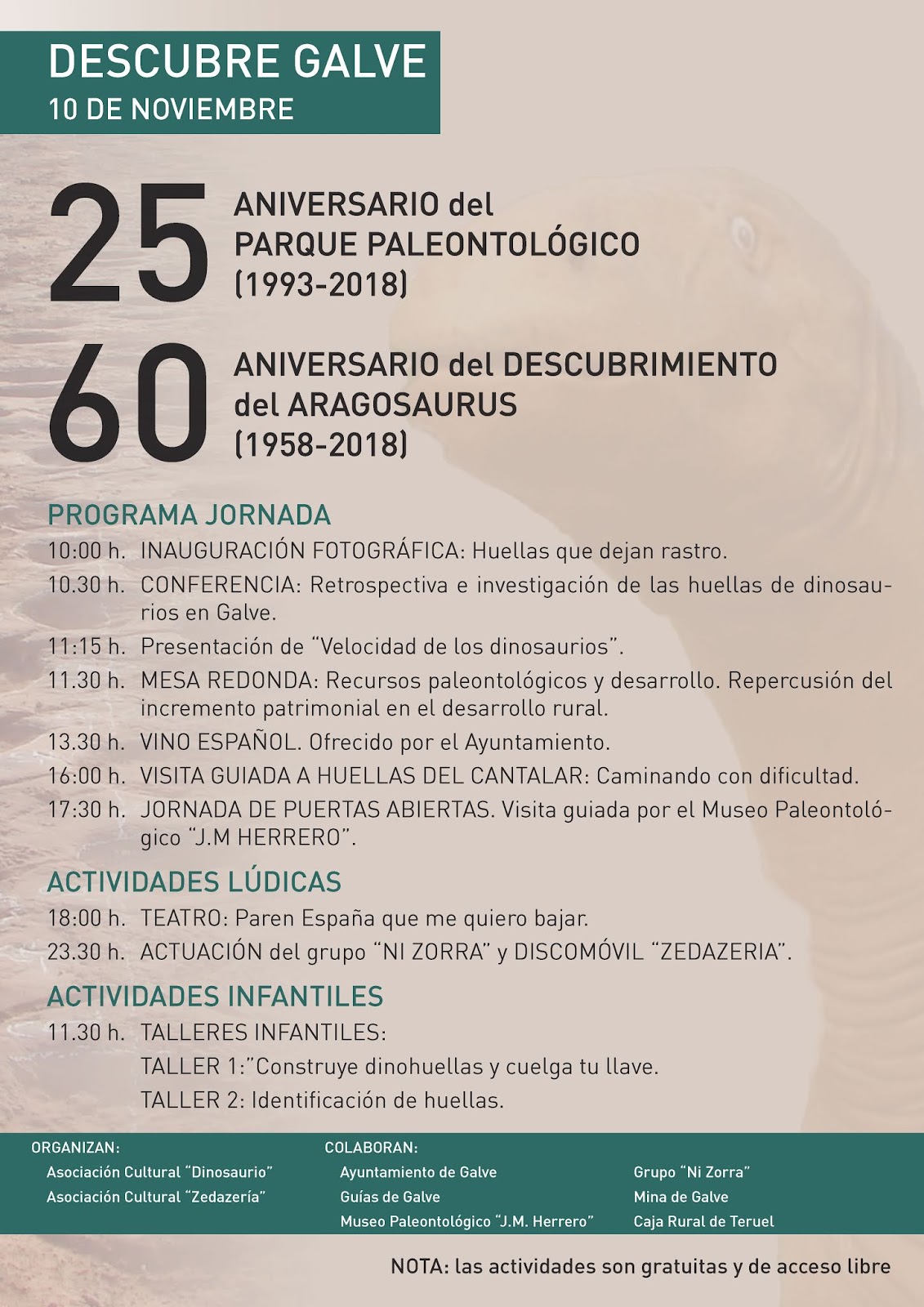 Se acumulan los eventos científicos y culturales en el Alto Alfambra. Algunos son muy importantes, como el que se celebrará en Galve el próximo sábado 10 de noviembre: el 25 Aniversario del Parque Paleontológico de Galve y el 60 Aniversario del hallazgo del Aragosaurus.