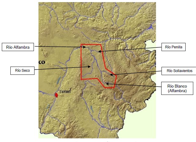 El río Alfambra nace a 1.800 m. al pie del pico Peñarroya (2.028 m.), en la vertiente norte de la sierra de Gúdar, y desemboca en el río Guadalaviar, junto a la ciudad de Teruel, formando entre ambos el río Turia. Drena en total, un territorio de 1.425,39 km cuadrados de superficie, casi una décima parte de la provincia de Teruel.