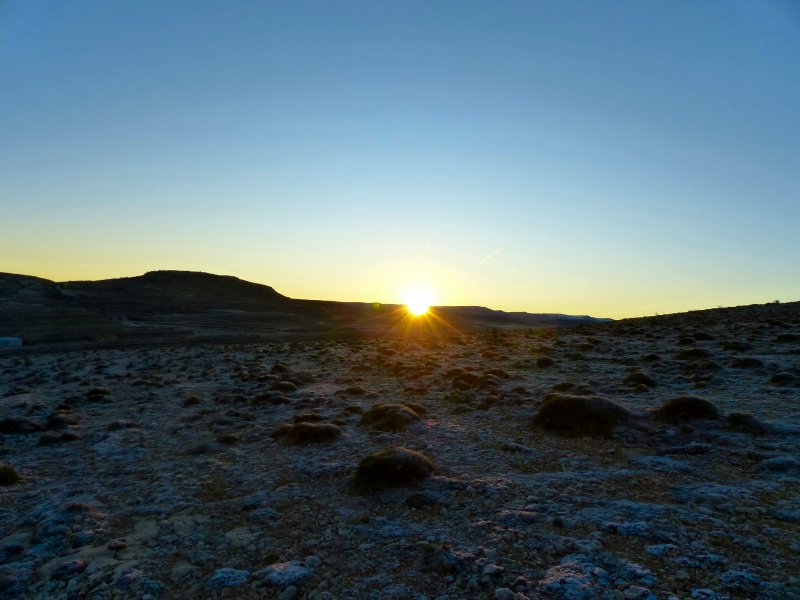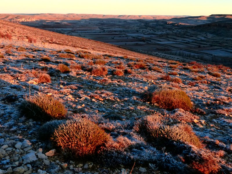 Tras una larga noche, el Sol asoma por los montes de Jorcas. Otra noche de helada en la loma. Los erizos aguantan estoicos el aire frío, que a uno le muerde en la piel. Nada se mueve. Nada se oye.
