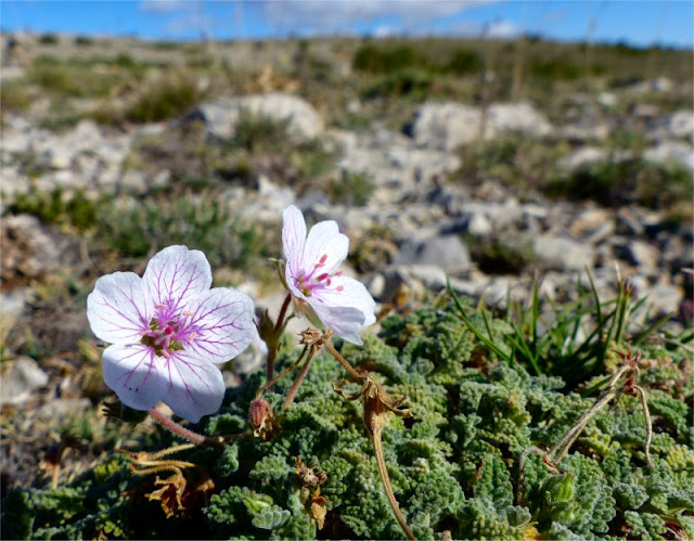La planta siempre permanece todo el año con vástagos por encima del suelo en forma de almohadilla. Los tallos son leñosos. La flor se identifica con pétalos rosados o violáceo pálido, con venas de color purpúrea. El fruto tiene aspecto de “pico de cigüeña” y se agrupa en ramilletes.