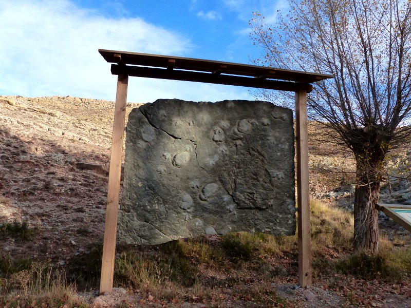 Y, ya de vuelta hacia el pueblo, estuvimos interpretando el panel de réplicas de icnitas de dinosaurio del cercano yacimiento de El Hontanar …